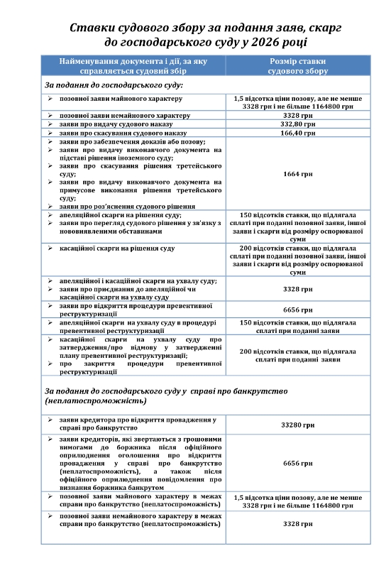 Звертаємо увагу, що у зв’язку зі зміною розміру прожиткового мінімуму для працездатних осіб з 1 січня 2026 року діятимуть нові розміри ставок судового збору.